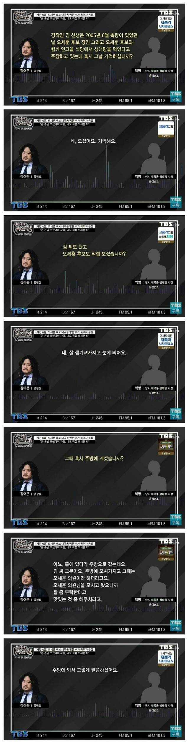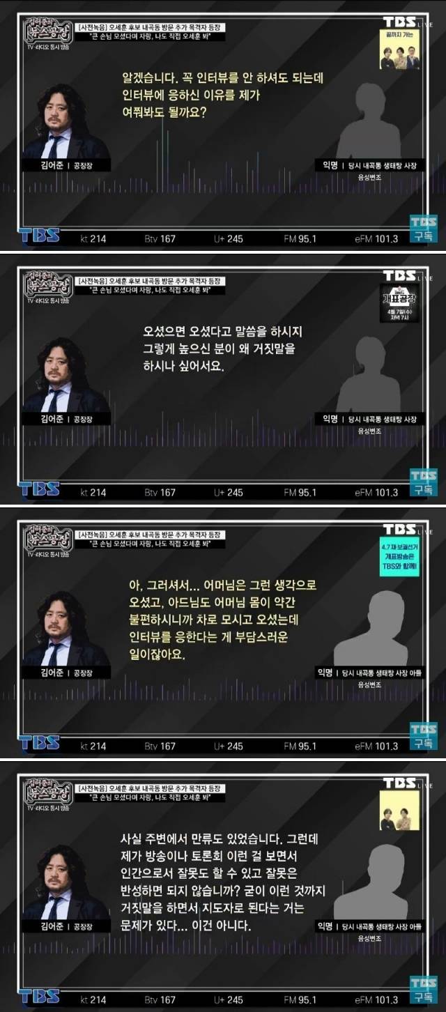 A씨는 인터뷰에 응한 이유에 대해 “(오 후보가 식당에) 오셨으면 오셨다고 말씀을 하시지, 그렇게 높으신 분이 왜 거짓말을 하시나 싶어서”라고 설명했다. 아들도 “주변에서 만류도 있었지만 방송이나 토론회를 보면서 인간으로서 잘못도 할 수 있고, 잘못은 반성하면 되지 않나. 그런데 굳이 이런 것까지 거짓말을 하면서 지도자로 된다는 건 문제가 있다. 이건 아니다”라고 했다. 한편, KBS는 오 후보가 2005년 6월 내곡동땅 측량 때 입회했다고 주장한 큰처남 송아무개 경희대 교수가 당일 경희의료원 병원경영 MBA 과정 수료식에 참석한 사진을 추가 확보해 보도했다.